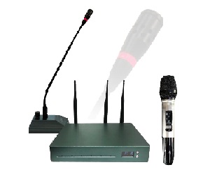 數位式音質處理 支援同時1主席+4列席5位在線發言 同時連接99支以上(鵝頸或手握) 二路音頻輸出(XLR及6.3mm) 傳輸方式2.4G無線射頻
